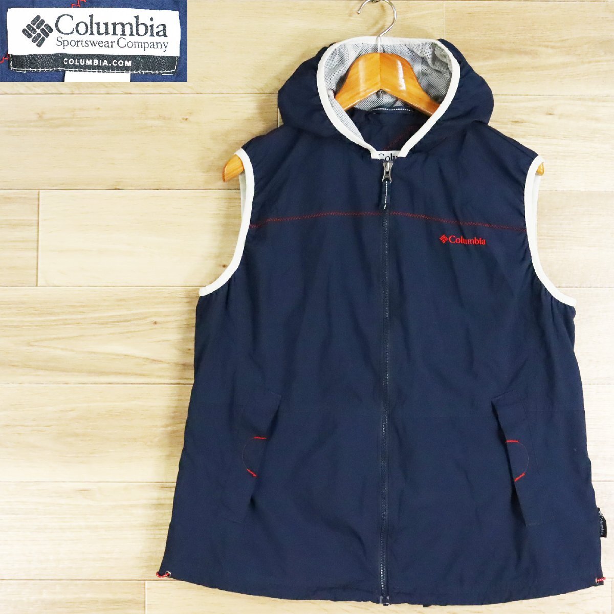 - D2S/O4.29-1 Columbia コロンビア フード付き ナイロンベスト ジップアップ ノースリーブ ロゴ刺繍 アウトドア レディース XL