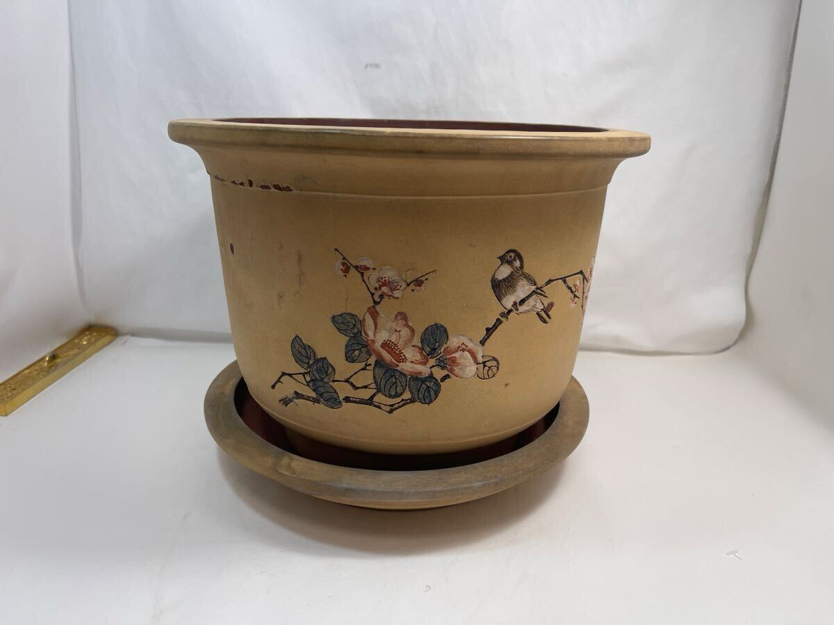 - 【SPD-3】朱泥 白絵 色絵 花鳥紋 花盆セット「中國宜興」「玉琴」在銘 花盆 花鉢 花器 盆栽鉢 華道具 時代物 中国古美術