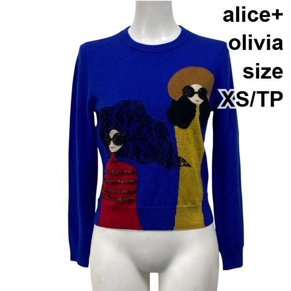 - アリスアンドオリビア alice+olivia ニットセーター ステイシーフェイス 長袖 ビジュー ブルー 毛100% XS/TP XS 5号 レディース S5V713