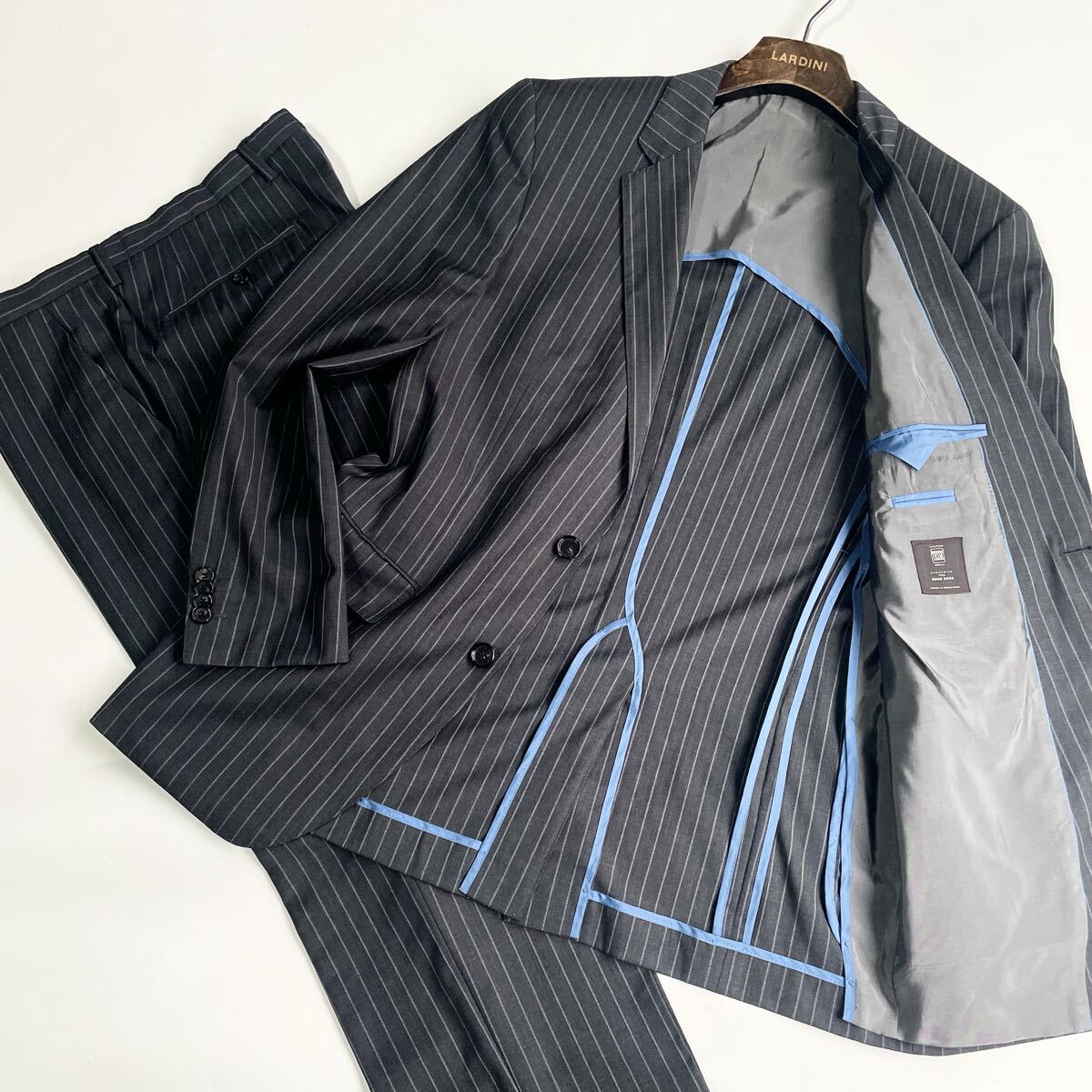 > HUGO BOSS ヒューゴボス LANIFICIO TESSE BIELLA ヴァージンウール チャコールグレー ST柄 ブルーパイピング セットアップスーツ 50 XL相当