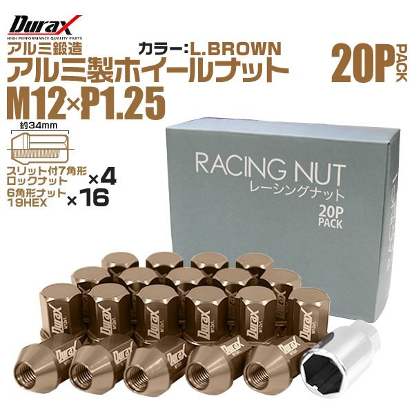 > Durax アルミ製ロックナット M12xP1.25 袋ショート 非貫通 34mm 鍛造ホイール ラグ ナット 20個セット 日産 スズキ スバル ライトブラウン