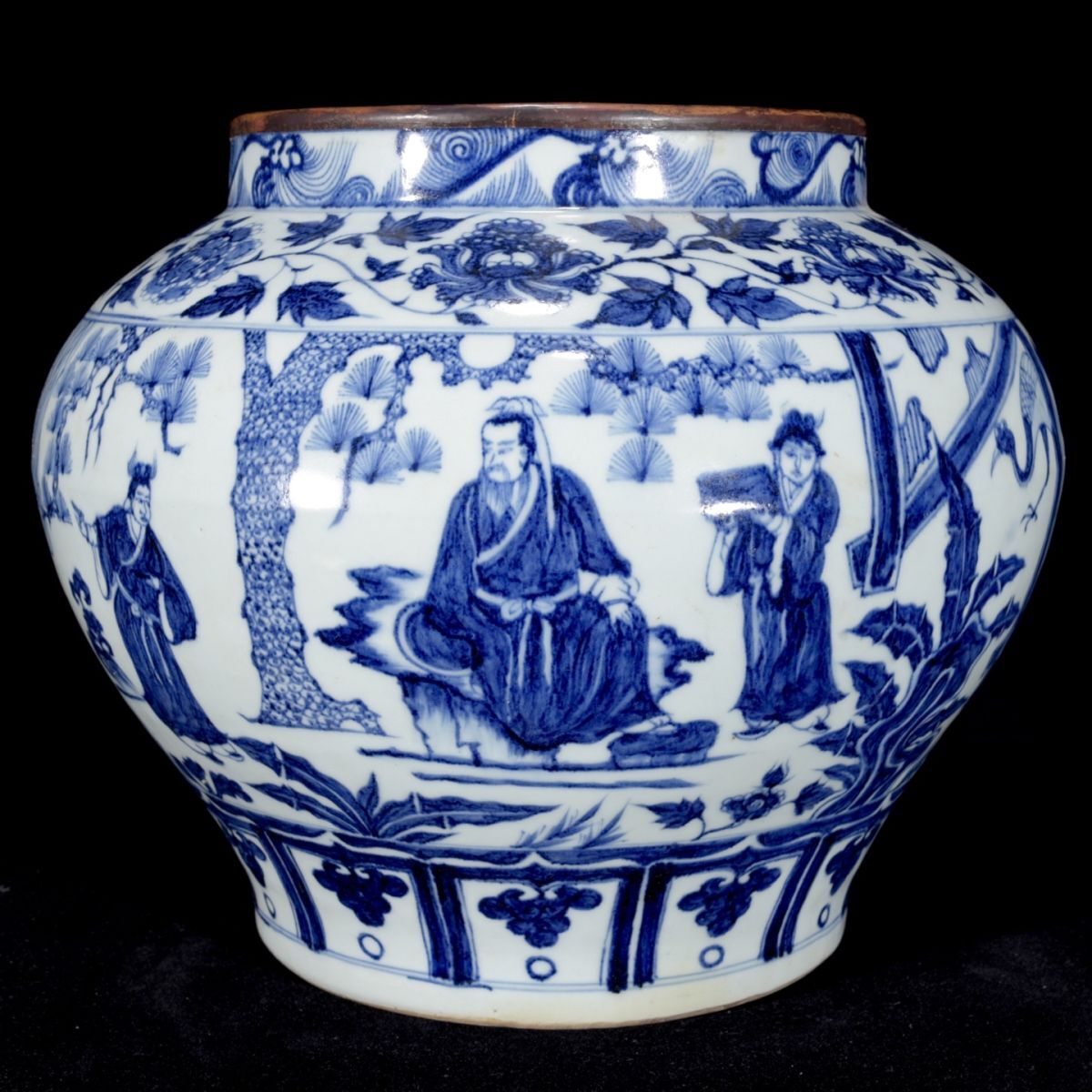 - 【永】元時代 銅包口青花 人物故事紋罐 古陶磁器 陶芸 皿 中国陶瓷器 唐瓷 置物擺件 古美術品 古賞物 収集 旧家蔵出 中国唐物 A159