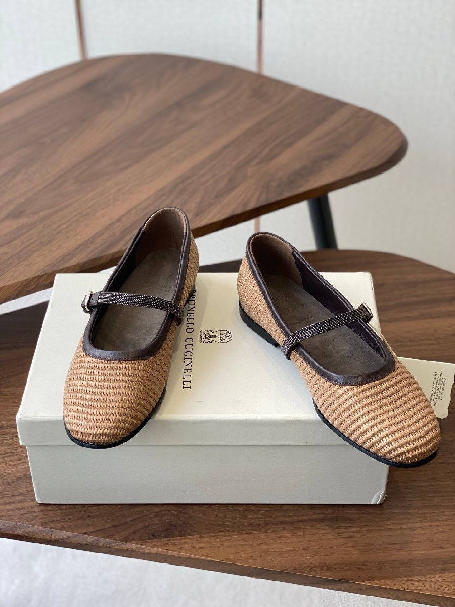 > ブラウン24.0cm★送料無料【新品】★ブルネロクチネリ★レディース ラフィア メリージェーン フラット シューズ, ビーズ装飾付き,