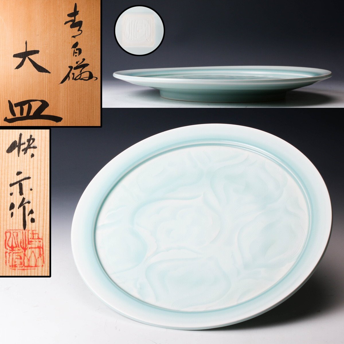 【佳香】人間国宝 塚本快示 快山窯 幅33cm 青白磁大皿 共箱 本物保証