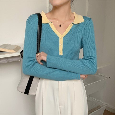 - 1円 同梱不可 カジュアル レトロ ニット生地 poloネック プルオーバー セーター カットソー フリー ブルー