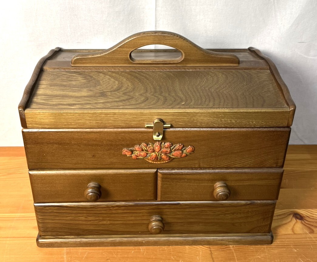 - 【S335】昭和レトロ/裁縫箱/木製/ソーイングボックス/大容量/手芸用品色々/糸/待針/ミシン糸/ボタン/小物入れ/レトロ/収納ボックス/中古
