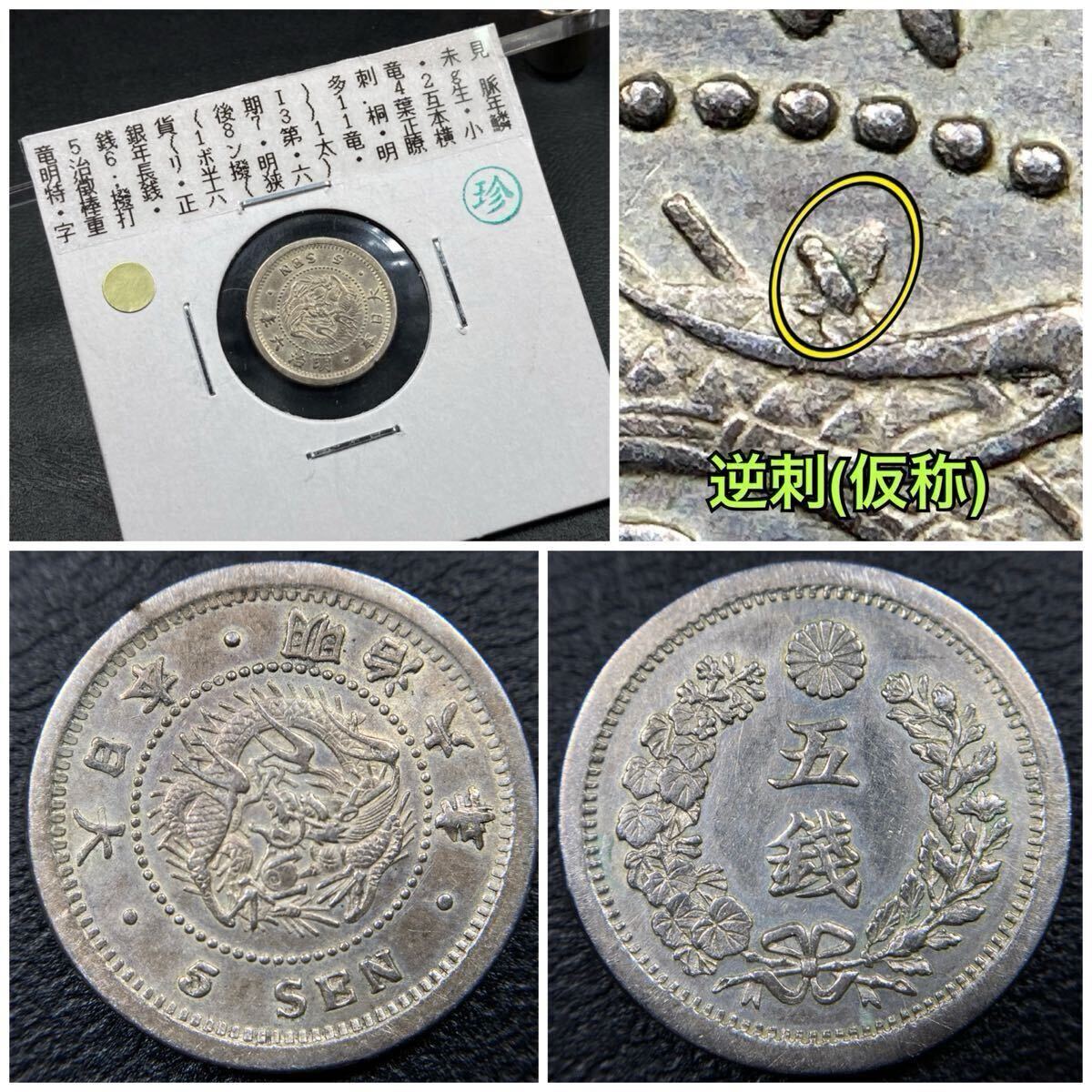 - 13、古銭【未見 手変わり(珍)】☆竜5銭銀貨 明治6年★多刺竜《逆刺(仮称)》