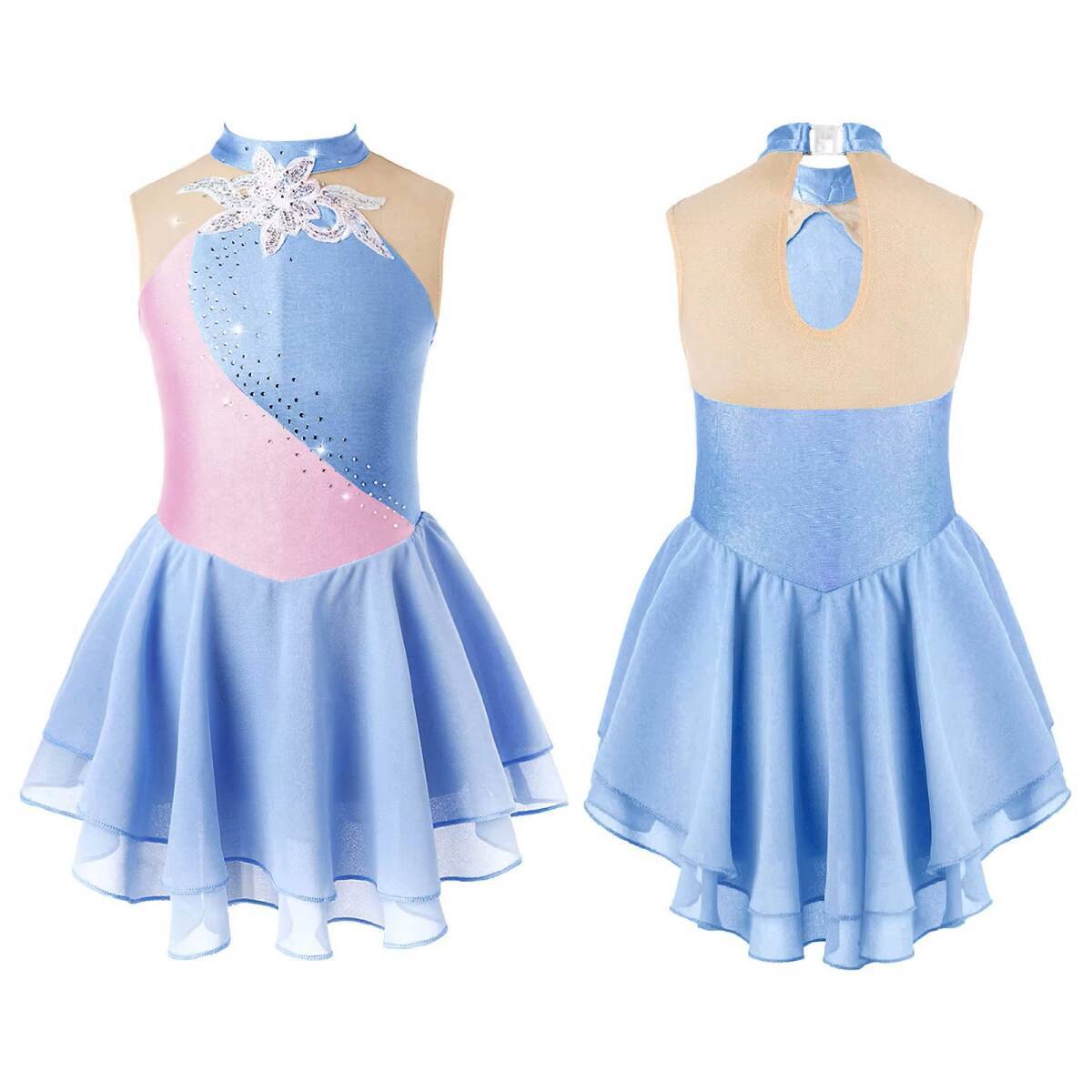 > 大きなUS16サイズ シアンブルー パフォーマンスウェア ラインストーンスパンコールコスチューム アイススケートステージダンスウェア