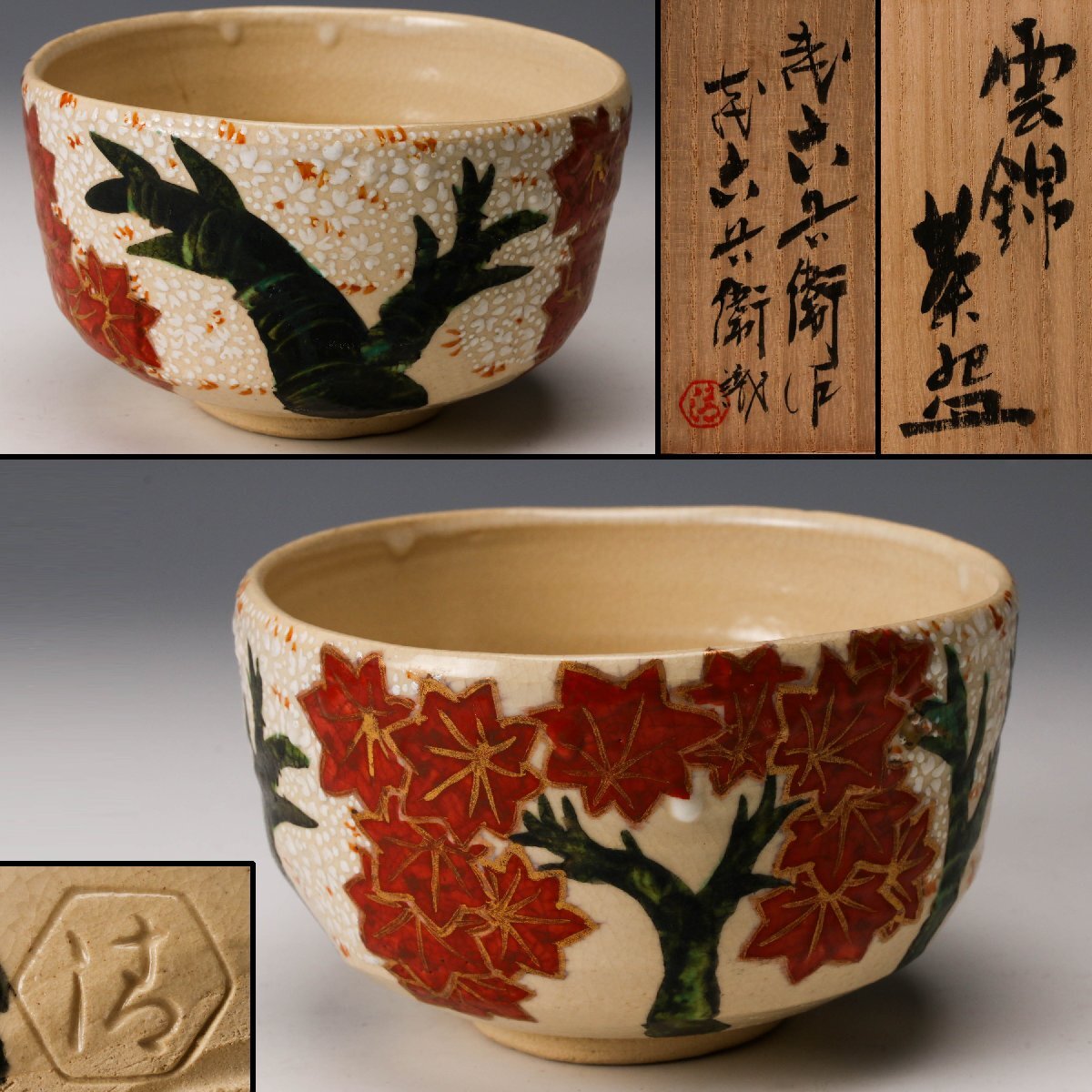 > 【佳香】五代 清水六兵衛 雲錦茶碗 七代 清水六兵衛識箱 共布 茶道具 本物保証