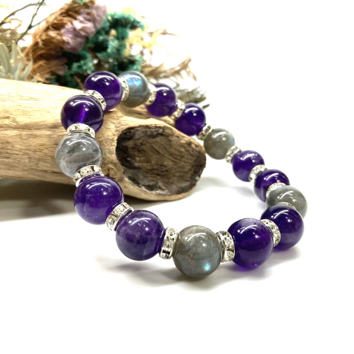 > ラブラドライト&アメジスト パワーストーン ブレスレット 天然石ブレス (シルバー) 12mm メンズ・レディース 男性 女性 幸運 数珠ブレス