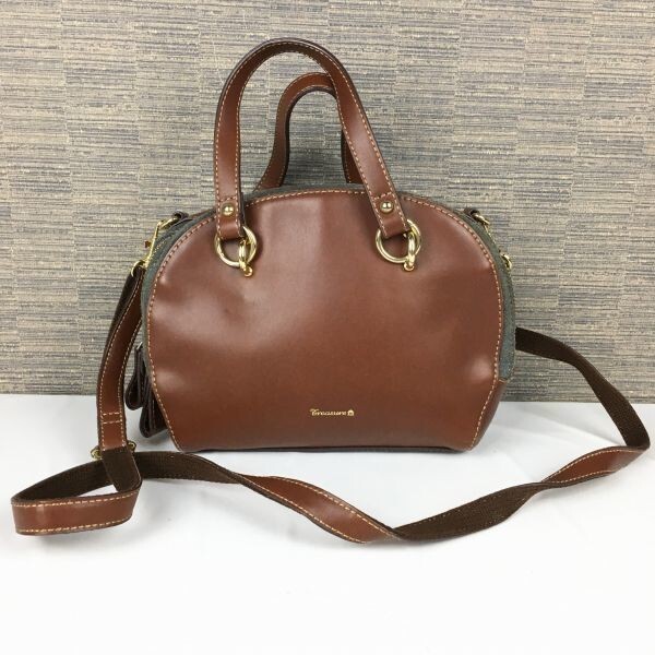 > TREASURE TOPKAPI/トレジャートプカピ レザー ハンド ショルダーバッグ ダークブラウン/焦げ茶 無地 収納2箇所 管NO.B13-51