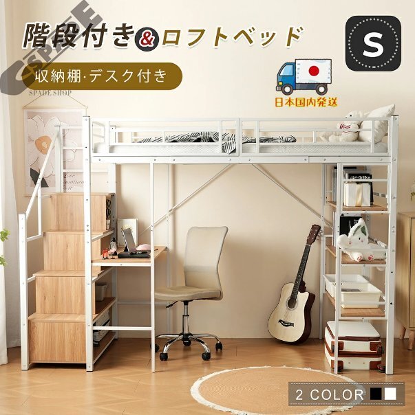 - 【国内発送】ロフトベッド パイプベッド シングル デスク付き 収納棚 階段付き 左右入れ替え可能 ロフトベッド 収納 大人 一人暮らし 子供