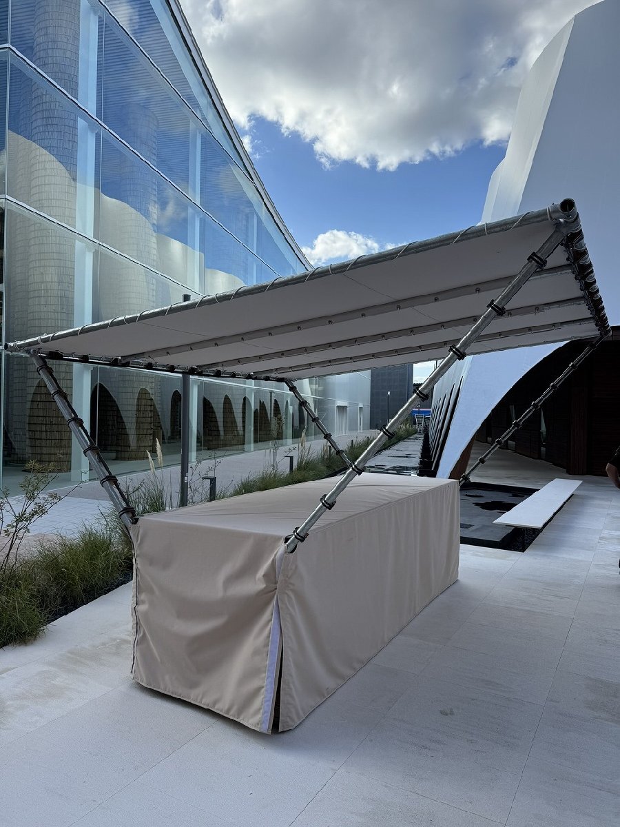> 引-4051 ♪ G 大阪 引取限定 移動式屋台 約3600×1200 H1080 冷蔵庫 変圧器 シンク付 飲食店 テント付き屋外キッチンブース 店頭販売 中古