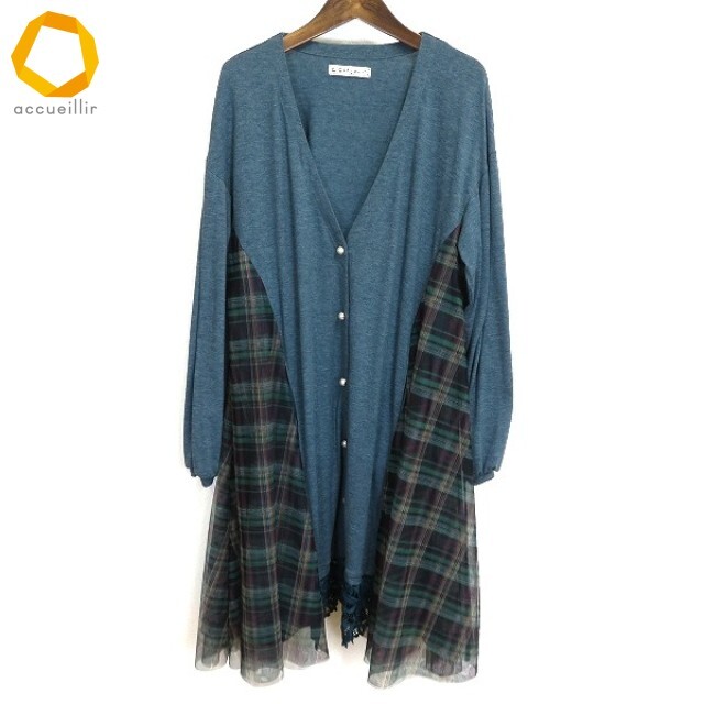 > #a スカラー ScoLar ロング カーディガン M 青緑系 マルチ チェック Aライン パールボタン レース レディース [955878] k01
