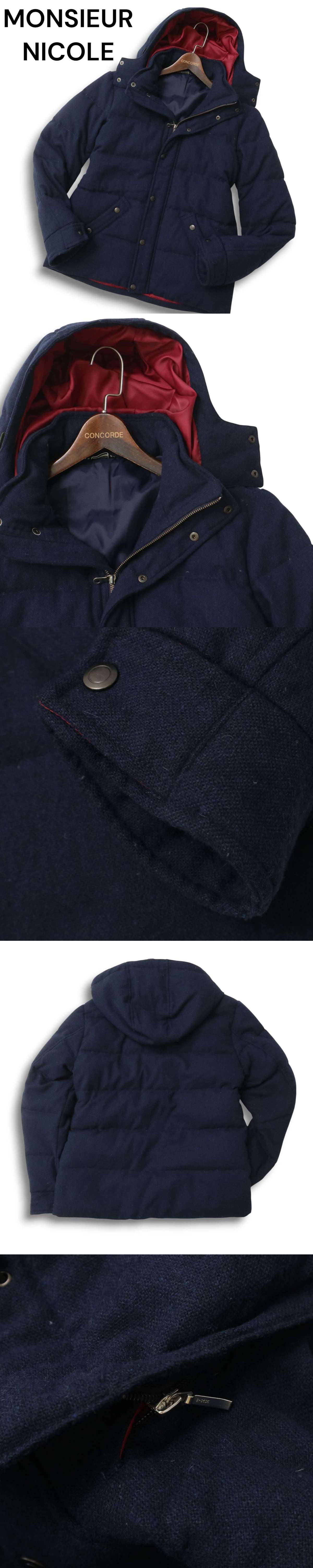 > MONSIEUR NICOLE ムッシュ ニコル 秋冬 フード着脱可★ 中綿 ツイード ジャケット ブルゾン Sz.48 メンズ 紺 ネイビー