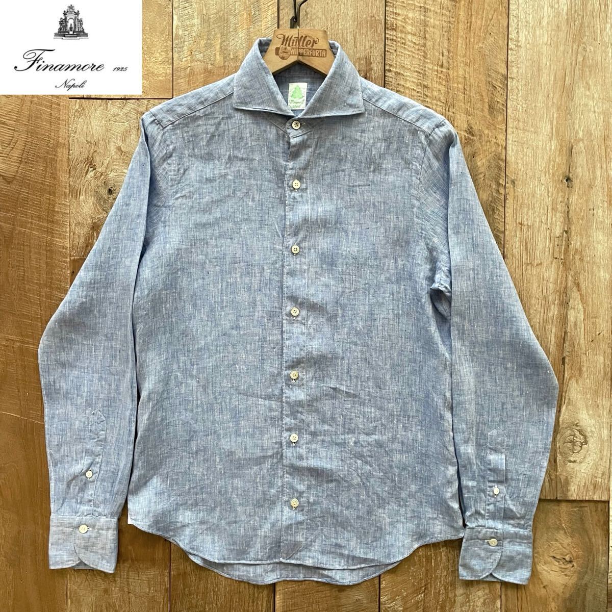 > 【極美品】Finamore フィナモレ ホリゾンタルカラー カッタウェイ 長袖 リネン シャツ 39 ブルー BEAMSF取扱