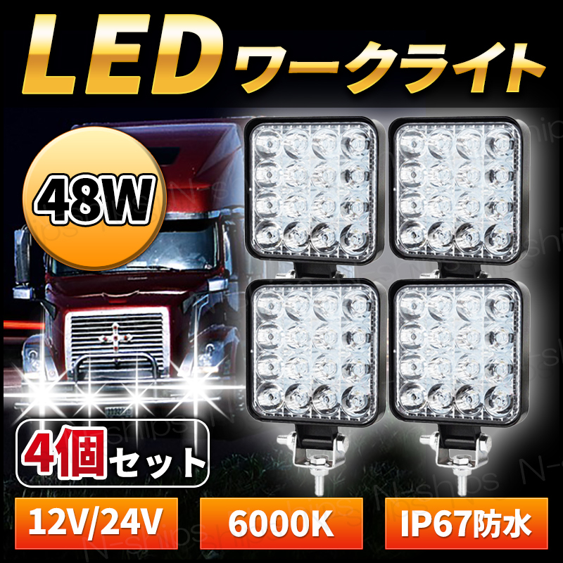 - LED 作業灯 ワークライト 12V 24V 48W 兼用 4個セット 防水 防塵 高輝度 16連 屋外 車 投光器 トラック ホワイト サーチ フォークリフト
