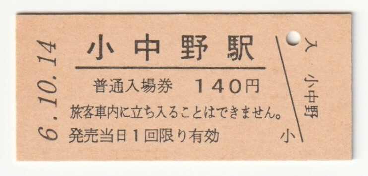 - 平成6年10月14日 八戸線 小中野駅 140円硬券普通入場券(日付印刷)