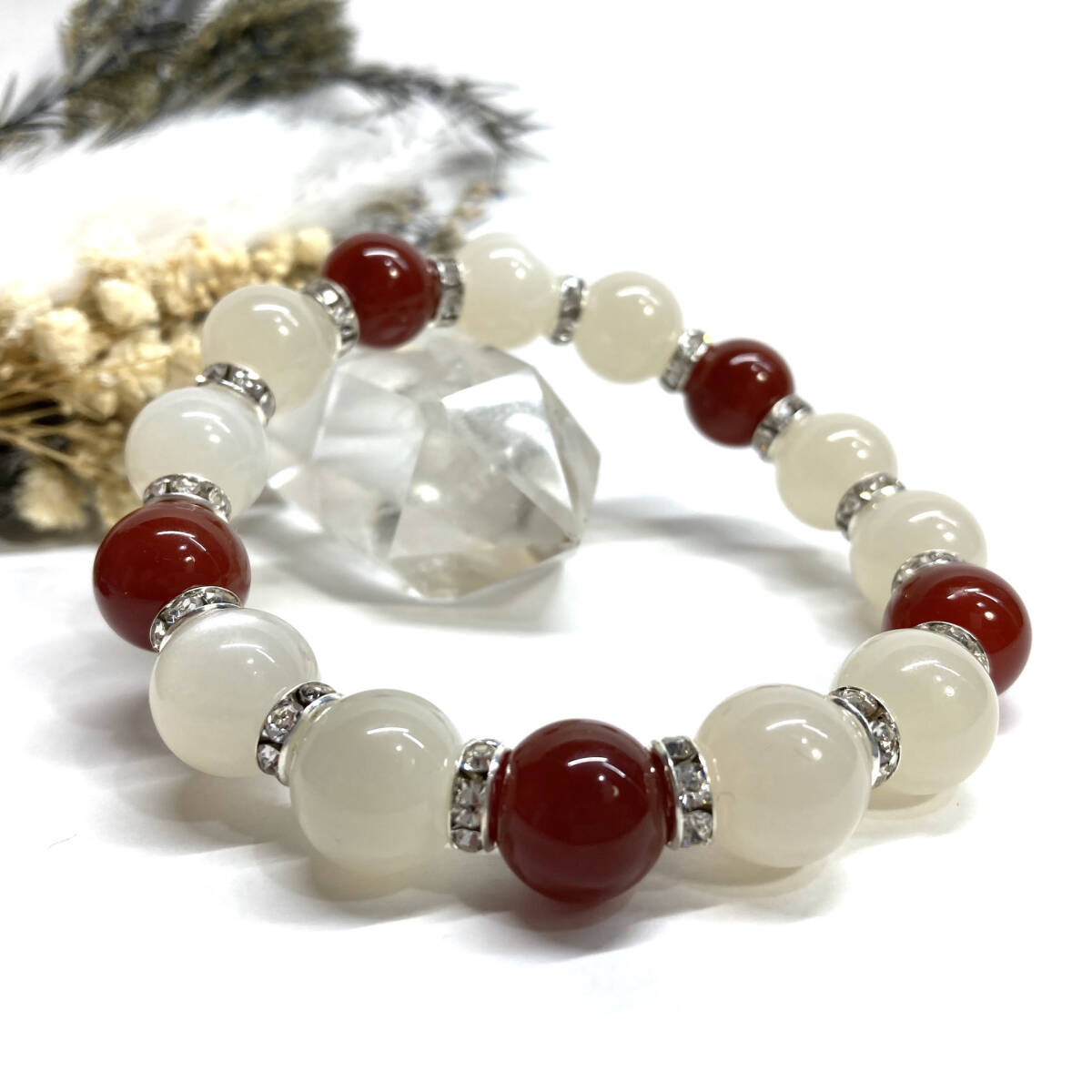 - ムーンストーン&赤瑪瑙 パワーストーン ブレスレット 天然石ブレス (シルバー) 12mm 幸運 開運 メンズ 男性♪