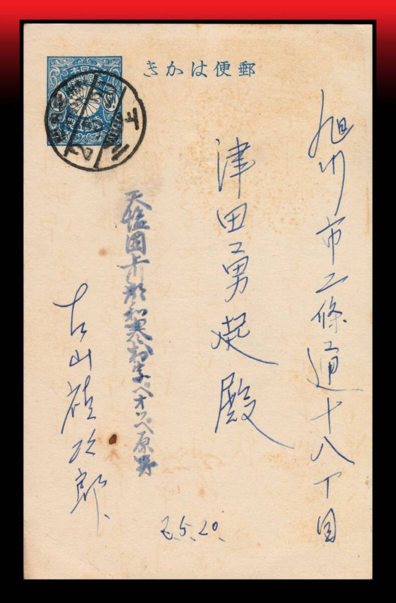 - Z42 鉄郵印/北海道|青分銅1銭5厘銘無し葉書 ペオッペ原野差出 鉄郵印:(旭)川(稚)内間/2.5.20/上二※一部難読 エンタイア