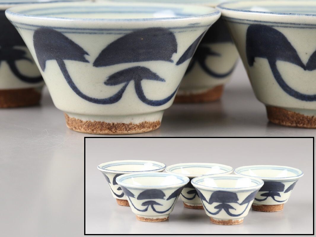 > 中国古玩 唐物 煎茶道具 染付 青華 煎茶碗 五客 時代物 極上品 初だし品 D4969
