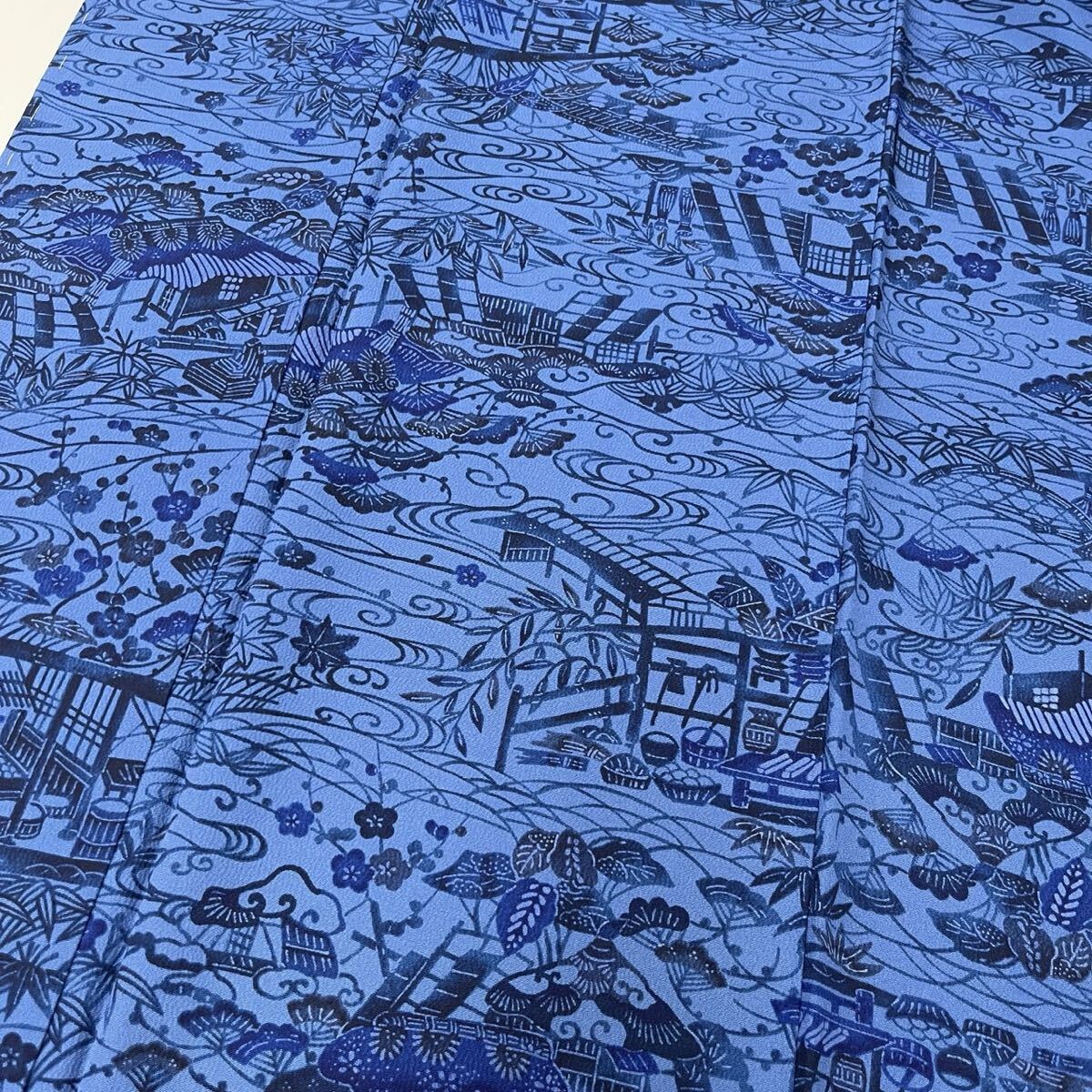 - 小紋 藍染 ちりめん 型染め 美しい染め 着物 正絹 F-881