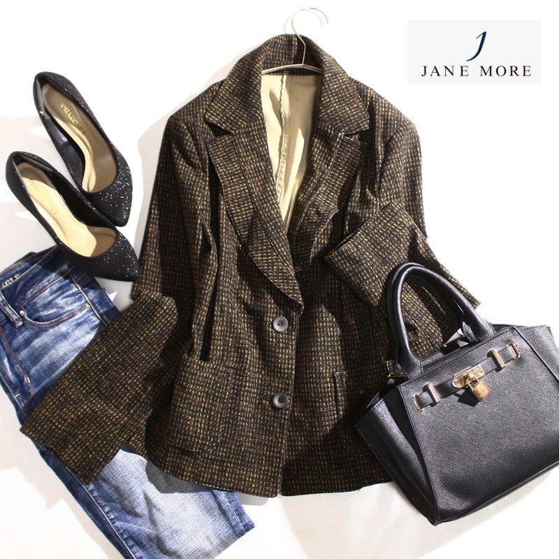 > 美品 ジェーンモア JANE MORE 株)オンワード樫山 ツイード 柄 プリント ストレッチ テーラードジャケット ブラウン 11号 ミセス ジャケット