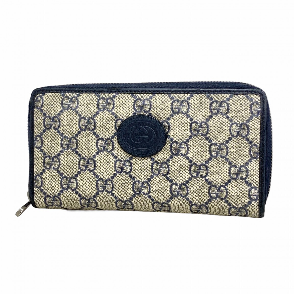 > 【5me6144】グッチ 長財布 GGスプリーム 673003 PVC ネイビー ベージュ シルバー金具【中古】メンズ レディース ユニセックス