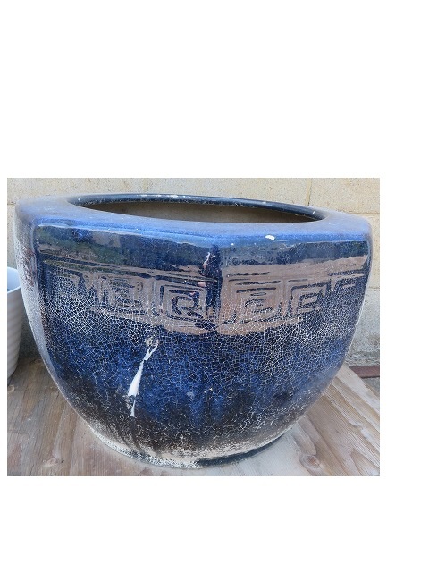 > KZ☆火鉢 青系 特大 陶器 焼物 壺 カメ 古民具 メダカ鉢 ◎現状品 引取限定 大阪和泉市