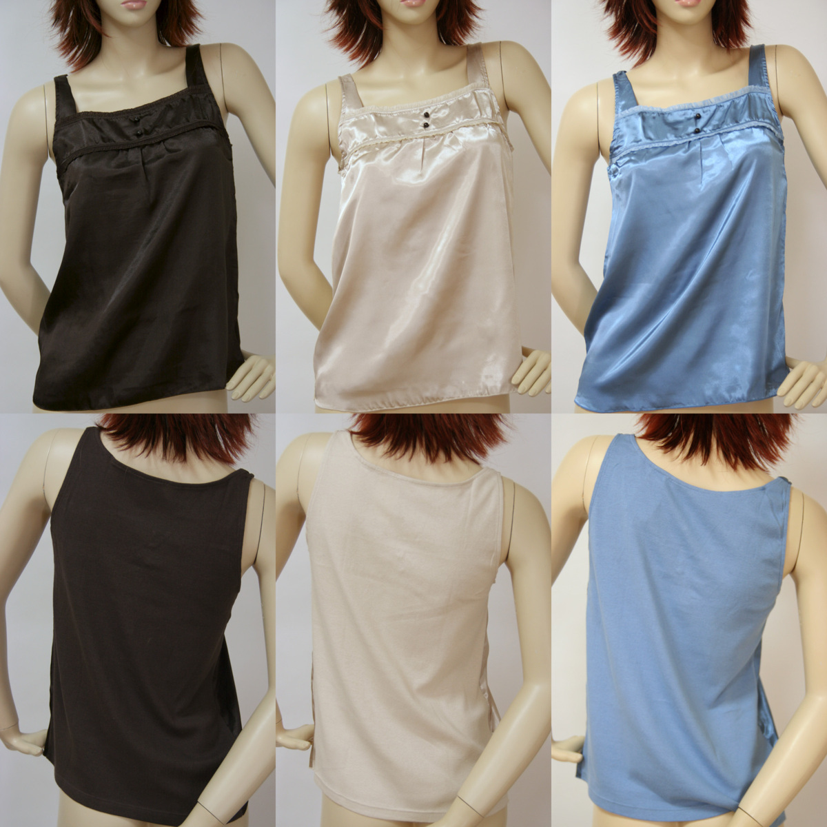 > 送料無料◆3色×2組◆計6枚◆【前身】サテン生地&【後身】綿100%◆ラン型キャミソール(L/ペールブルー&シャンパンベージュ&ダークブラウン)