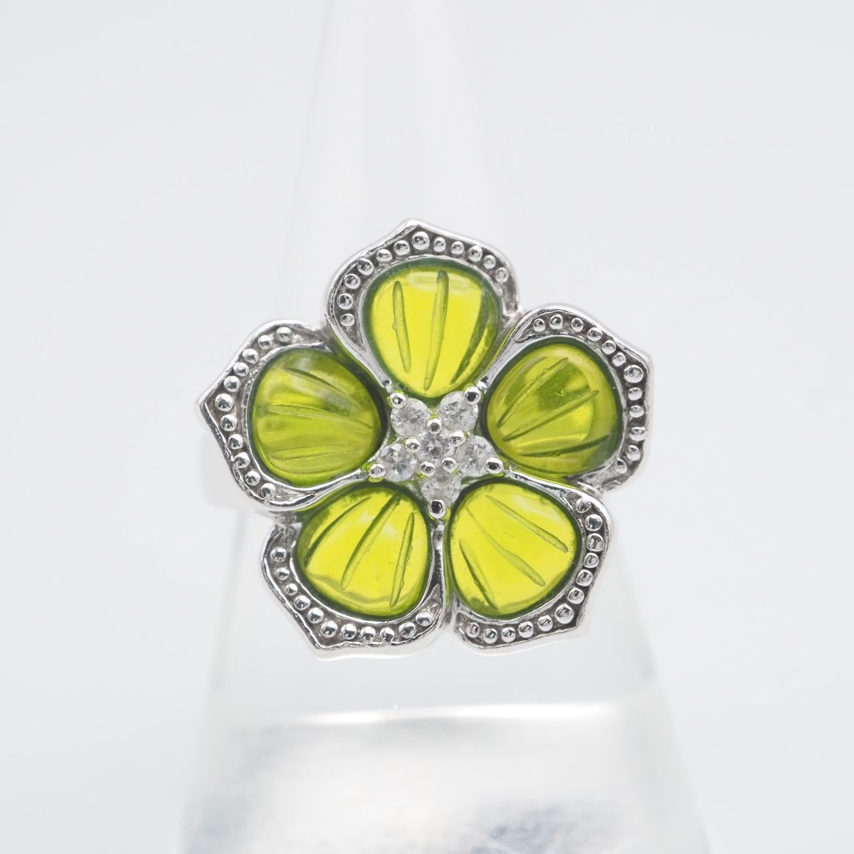 - H601 グリーンガラス ダイヤモンド風 925刻印 リング フラワー デザイン シルバー 指輪 16号