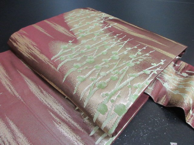 - 1円 良品 名古屋帯 正絹 和装 和服 枝木 霞 草花 六通柄 九寸帯 長さ346cm【夢職】★