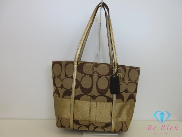 > コーチ COACH トートバッグ 11098 シグネチャー ストライプ カーキ ゴールド キャンバス レザー ロゴ ハンドバッグ 【中古】 bk10045