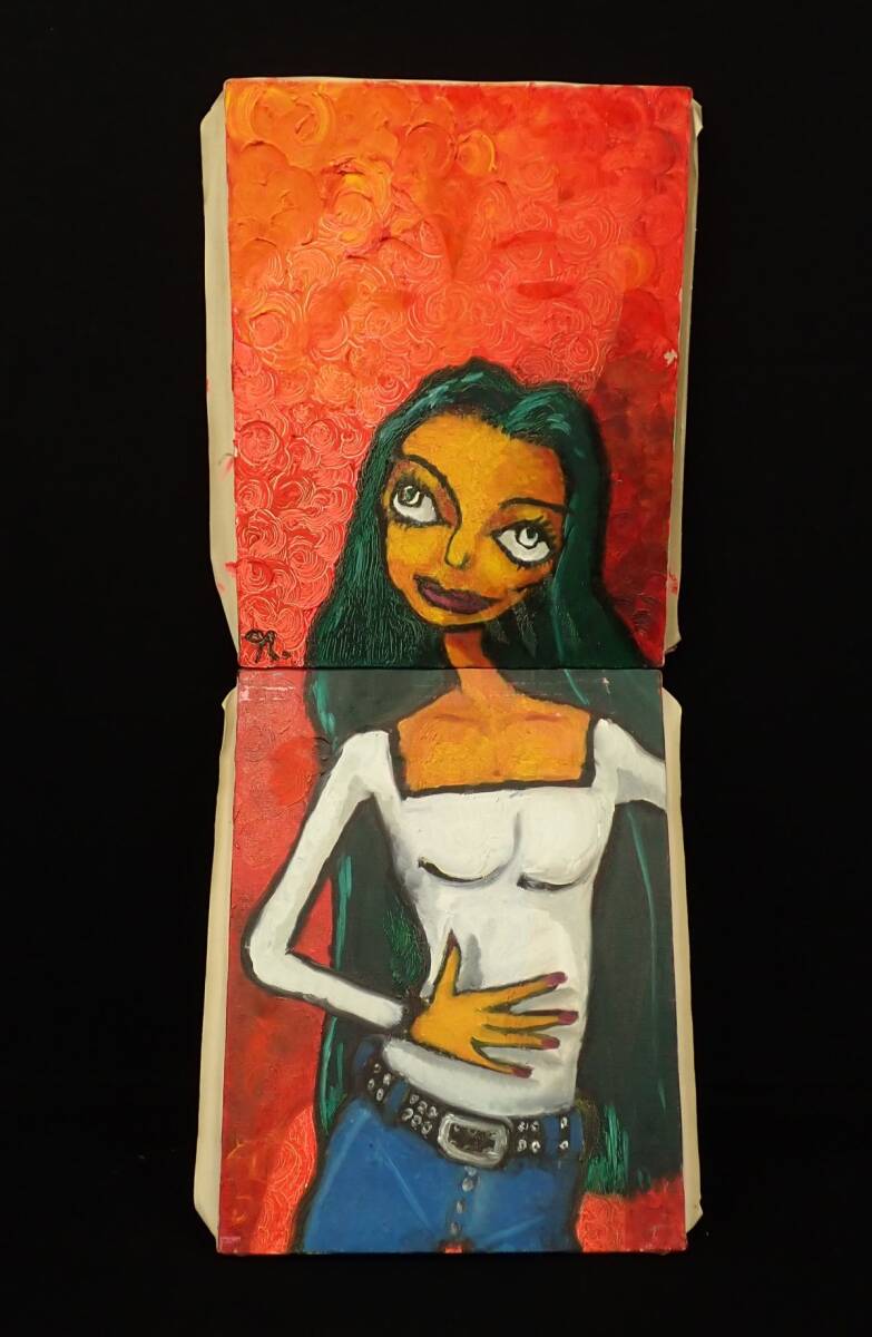 - ◆絵画43 異色油彩画 作者不明「赤の中の彼女」上下2枚◆70年代風/消費税0円