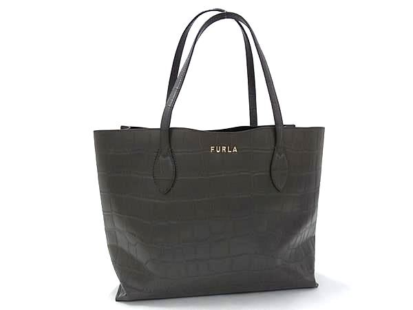 > 1円 ■美品■ FURLA フルラ クロコダイル型押しレザー トートバッグ ショルダーバッグ 肩掛けかばん レディース グレージュ系 FU5014