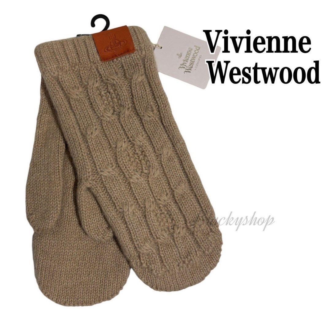- ヴィヴィアン ウエストウッド 手袋 ミトン ケーブル ニット グローブ 未使用 タグ付き メンズ ベージュ オーブ ロゴ レザー パッチ ウール