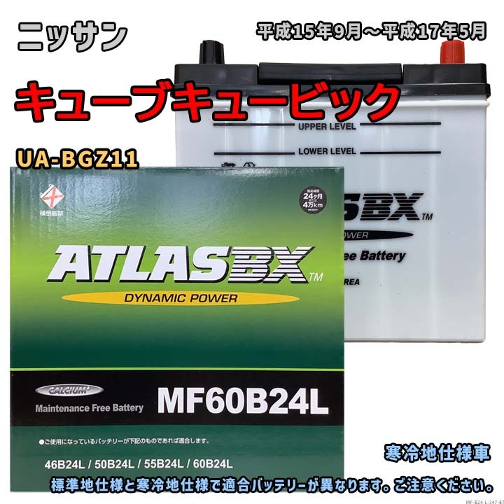 - バッテリー ATLAS MF60B24L ニッサン キューブキュービック UA-BGZ11 平成15年9月~平成17年5月 AT カーウィングス 対応 B24L 互換 347