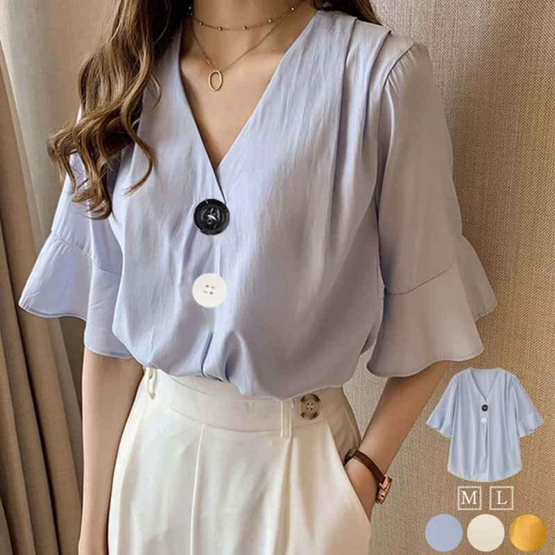- スキッパー シャツ レディース カットソー 五分袖 vネック ブラウス M イエロー