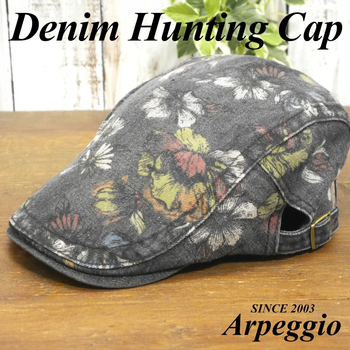> デニム 花柄プリント インディゴ ジーンズ ハンチング ブラック 黒 サイズ調整可 送料\450 男女OK! オールシーズンOK