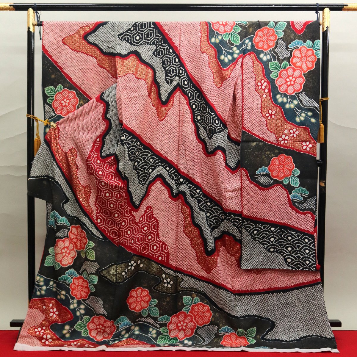 ※こちらの商品にはお仕立てはついておりません。 (出来上がり予想寸法 身長:172cm位、裄:最大68cm位) 正絹総絞りお振袖をご紹介致します。 こちらのお品には、赤い八掛けが付いております。衽八掛けにも表地と同じ柄が描かれております。 しっとりとした上質な生地は、赤色と黒色のお色目でございます。 全体には斜めによろけた様な霞のような模様取りが施されており、黒系、赤系が交互に使われております。中には菊や亀甲文、青海波文などが絞りで表現されております。 古典的で王道な感じのするお振袖でございます。 帯合わせや小物合わせで、大人っぽくも可愛らしくもお召しいただけることでしょう。 -状態・素材:正絹 -落款・証紙: -参考着用年代:10代~40代 -着用時期 :10月~5月