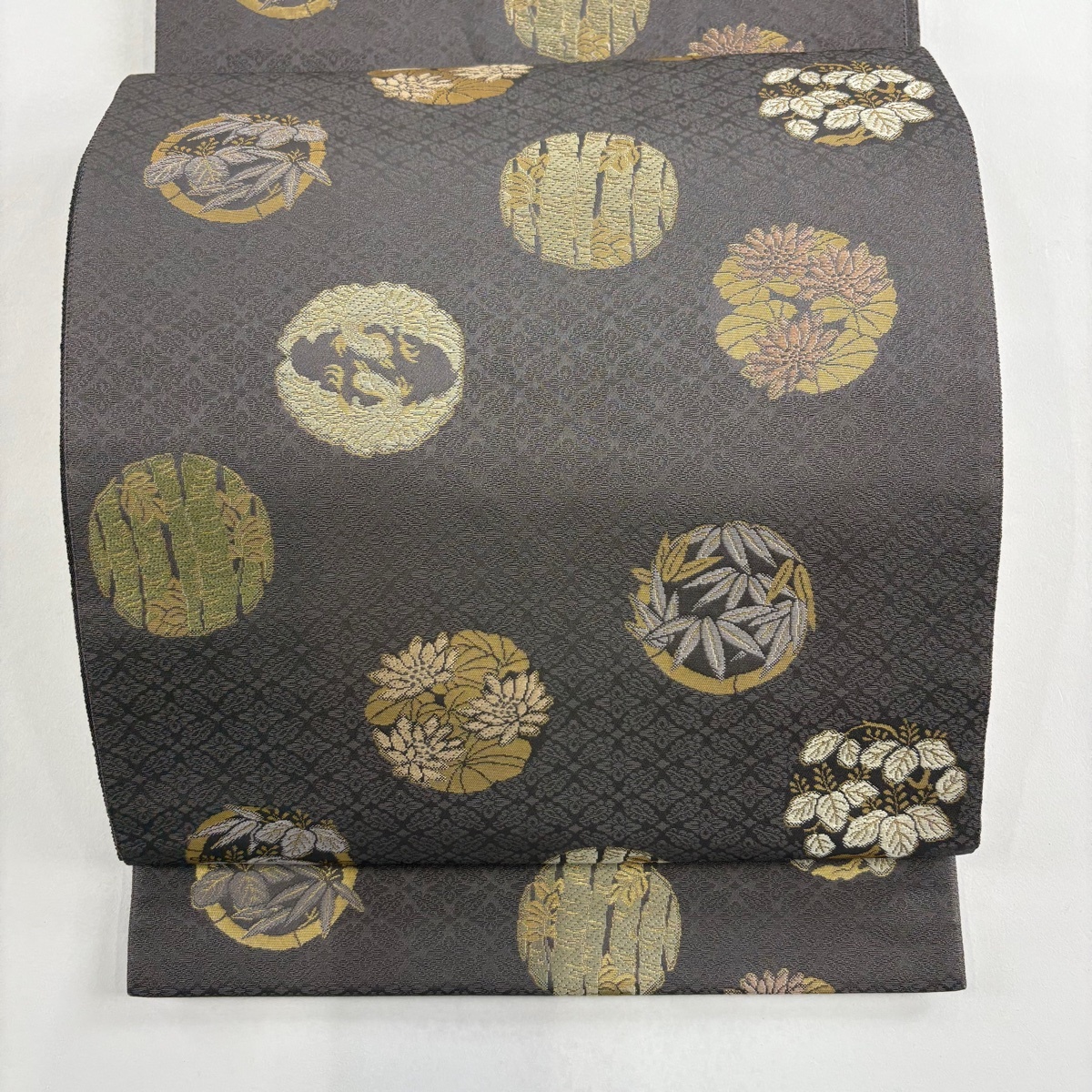 - 【美品】 袋帯 名品 箔屋清兵衛 落款 桐竹鳳凰御印文 箔 草木染 灰紫 六通 正絹 【中古】