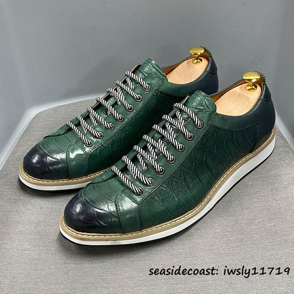 - 定価9万超◆最高級 スニーカー 本革 レザーシューズ メンズ ビジネスシューズ 牛革 革靴 職人手作り紳士靴 軽量ローファー グリーン 26.0cm