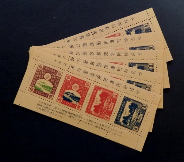 - P423■不発行「東宮御婚儀祝典記念」 小型シート 5枚 模刻品■未使用・良好