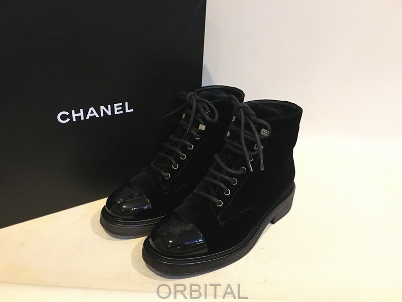 - 二子玉)CHANEL シャネル エナメルベルベットショートブーツ レースアップ ブラック 黒 CCロゴ レディース 37 23.5cm