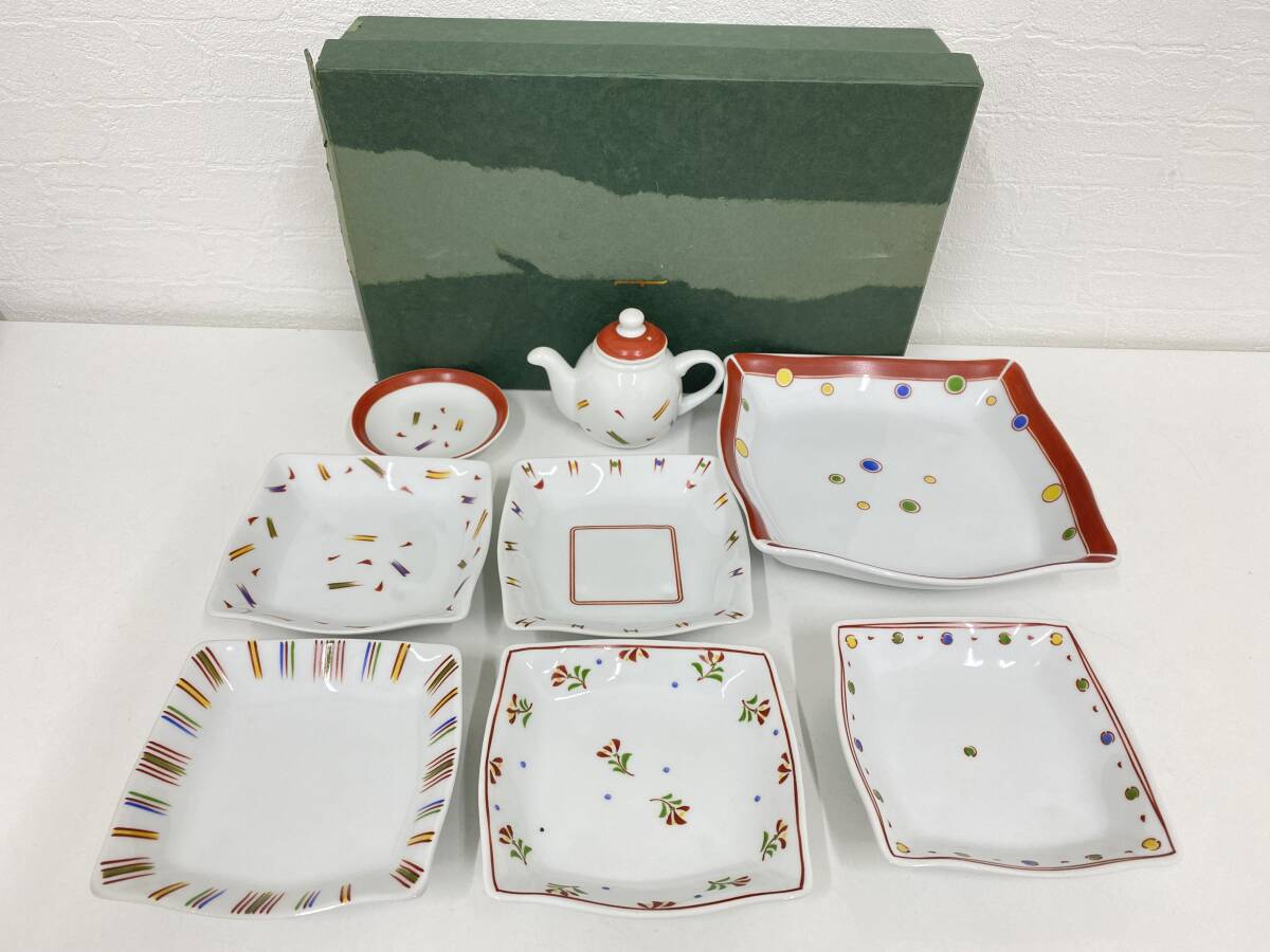 > E-1178 【同梱不可】980円~ 現状品 庫山 お皿セット お皿 スクエア 小皿 大皿 調味料入れ 和食器 食器 箱付き