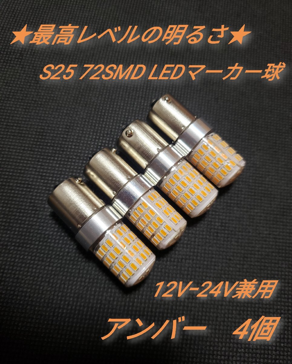 - 24V 12V兼用 S25トラック用品 LED シングル球 マーカー球 マーカー トラック バルブ アンバー 4個 72SMD
