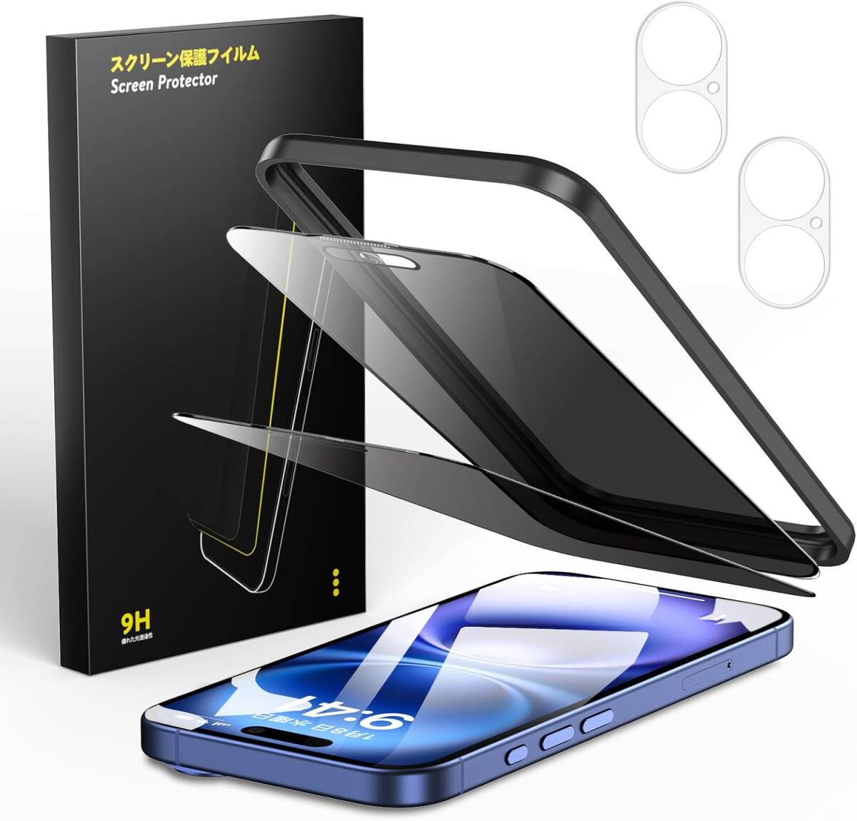 - 360°覗き見防止 ガラスフィルム iPhone 16 フィルム 2枚 + カメラフィルム 2枚