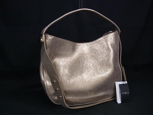 - 1円 ■極美品■ FURLA フルラ レザー 2WAY ハンドバッグ ショルダーバッグ 肩掛け 斜め掛け レディース メタリック ゴールド系 FU5129
