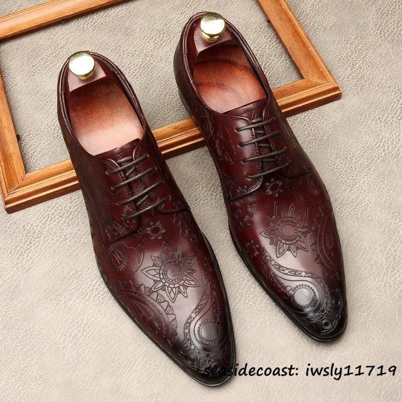 > 定価11万超★最高級 ビジネスシューズ 本革 レザーシューズ 超希少 職人手作り 総柄 牛革 紳士靴 メンズ フォーマル 革靴 レッド 27.0cm