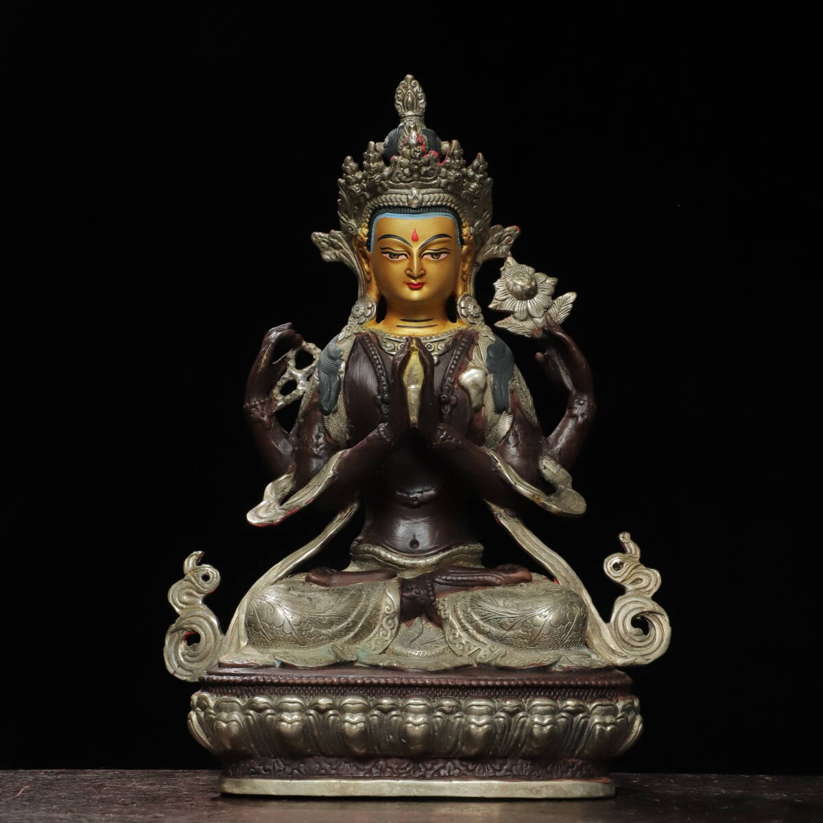 - 旧蔵 古銅彫 塗金 描彩 四臂觀音 佛像 古擺件 古置物 中国古玩 骨董品 時代物 稀少唐物